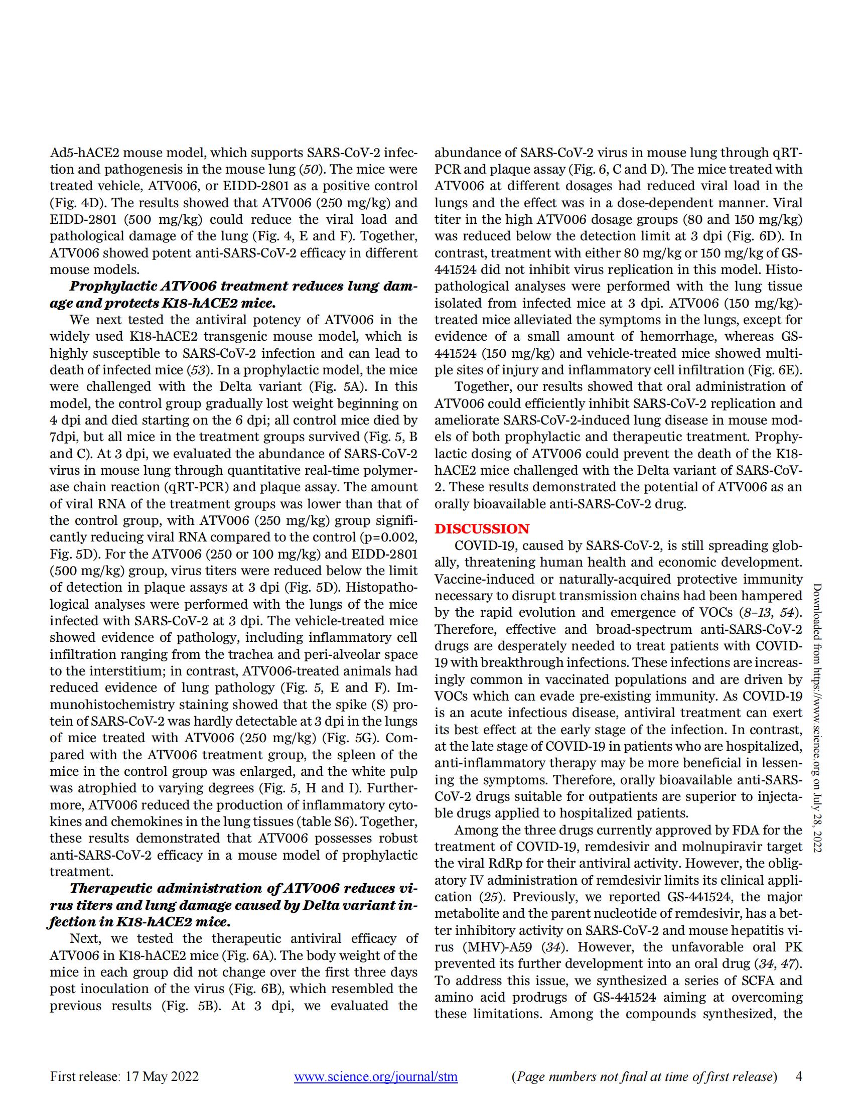 Cao L, Li Y, Yang S, Li G, Zhou Q, Sun J, Xu T, Yang Y, Liao R, Shi Y, Yang Y, Zhu T, Huang S, Ji Y, Cong F, Luo Y, Zhu Y, Luan H, Zhang H, Chen J, Liu X, Luo R, Liu L, Wang P, Yu Y, Xing F, Ke B, Zheng H, Deng X, Zhang W, Lin C, Shi M, Li CM, Zhang Y, Zhang L, Dai J, Lu H, Zhao J, Zhang X, Guo D. The adenosine analog prodrug ATV006 is orally bioavailable and has preclinical efficacy against parental SARS-CoV-2 and variants. Sci Transl Med. 2022 May 17:eabm7621. doi: 10.1126/scitranslmed.abm7621. Epub ahead of print. PMID: 35579533; PMCID: PMC9161374.